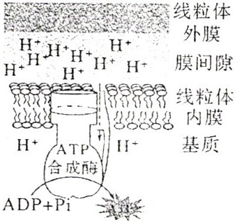 3.(2025·湘豫名校联考)如图所示为ATP合成酶结构及其作用机制。$H^+$沿着线粒体内膜上ATP合成酶内部的通道流回线粒体基质,推动ATP的合成。某些减肥药物能够增加线粒体内膜对$H^+$的通透性,降低$H^+$膜内外浓度差。下列相关叙述正确的是(