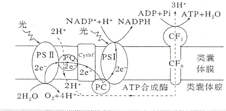 如图为类囊体薄膜上发生的光反应示意图,其中$PS$Ⅰ和$PS$Ⅱ分别是光系统Ⅰ和光系统Ⅱ,是叶绿素和蛋白质构成的复合体,能吸收利用光能进行电子的传递。其中$PQ$、$Cytbf$、$PC$是传递电子的蛋白质,$PQ$在传递电子的同时能将$H^+$运输到类囊体腔中,图中实线为电子的传递过程,虚线为$H^+$的运输过程,$ATP$合成酶由$CF_0$和$CF_1$两部分组成,则: