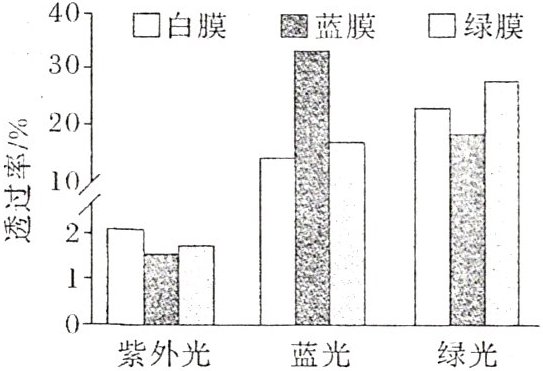 (1)位于叶绿体类囊体薄膜上的光合色素主要吸收红光和蓝紫光。光反应产生的NADPH和ATP参与暗反应中的$C_3$还原过程,使$C_3$转化为$(CH_2O)$和$C_5$。分析题图,蓝膜与绿膜对紫外光的透过率低于白膜,减弱了紫外光对幼苗的辐射。