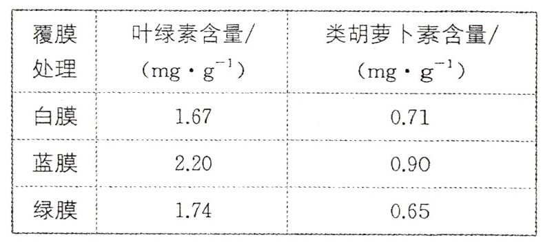 (3)蓝膜覆盖下蓝光透过率高于白膜和绿膜,有利于藏川杨幼苗进行光合作用;蓝膜覆盖下叶绿素含量和类胡萝卜素的含量均高于白膜和绿膜,藏川杨幼苗光合速率较强;蓝膜覆盖下紫外光的透过率低于白膜和绿膜,减弱了对幼苗的伤害 解析