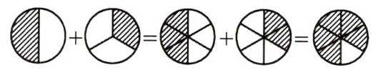 $\frac {1}{2}+\frac {1}{3}=()+()=()$
