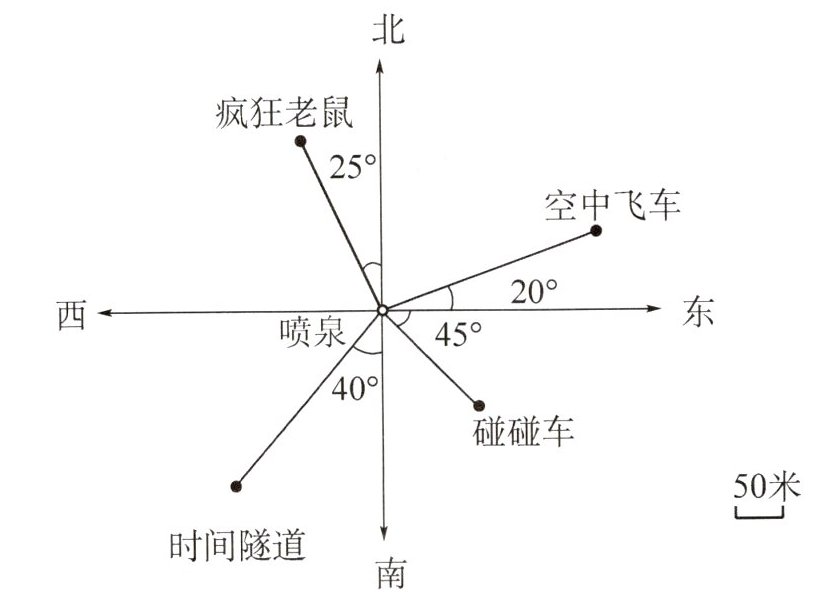 (2)空中飞车在喷泉( )偏( )( )°的方向上,距离是( )米。