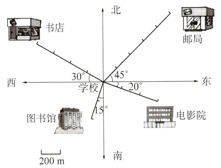 (1)邮局在学校东偏( )( )的方向上,距离是( )米。