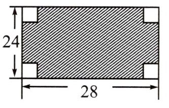5. 一块长28cm、宽24cm的长方形铁皮(如图),从四个角各切掉一个边长为4cm的正方形,然后做成盒子。这个盒子用了多少平方厘米铁皮?