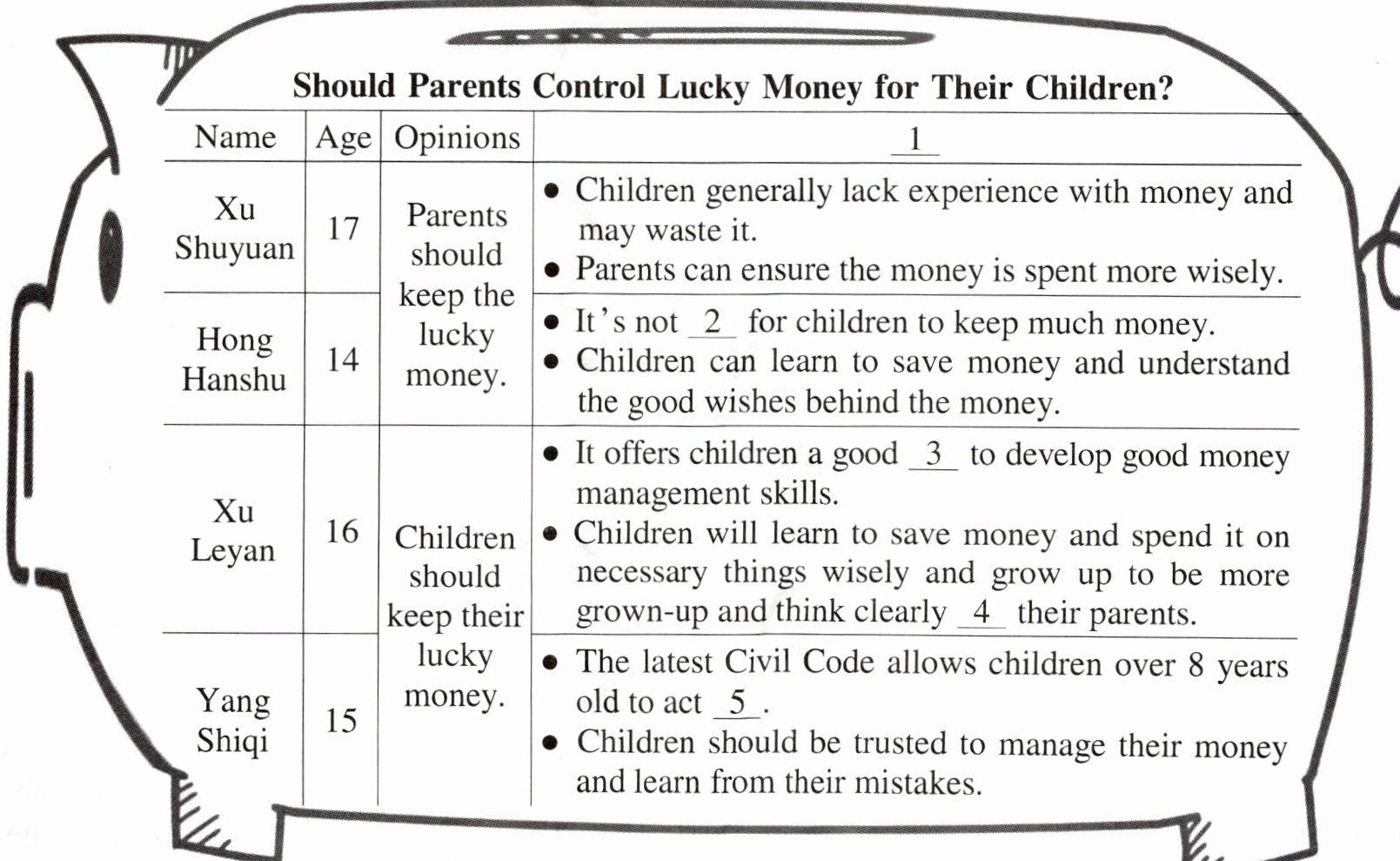 It's very hard for little kids to use their money smartly because there are many things that can distract(使迷惑)them. If they have lots of money, they might get tricked on the Internet or start spending it all too quickly. By letting their parents keep the money, kids will not only learn to save money, but understand the good wishes that come with the money.