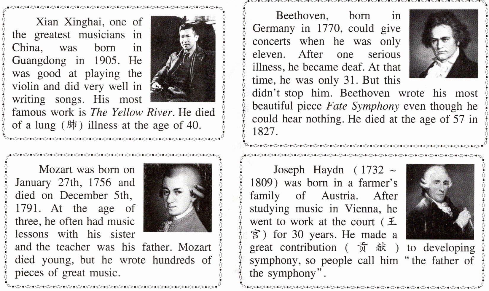 短文主要介绍了冼星海、贝多芬、莫扎特和约瑟夫·海顿这四位音乐家,A选项正确;短文未提及如何成为成功人士,B选项错误;也未要求人们向这四位音乐家学习,C选项错误;不只是介绍他们的早期经历,还包括其他方面,D选项错误。