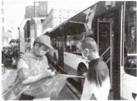 At Kanhou train station, you may meet a group of bus drivers wearing red hats. They stand beside their bus and ______ to help people who ask for ways. Liu Jun is one of them. With several notes and a pen, Liu often tells people the way ______ and gives every one of them a note with his words on it. Liu has a husky(沙哑的)voice. People think that it's the ______ of his hard work.