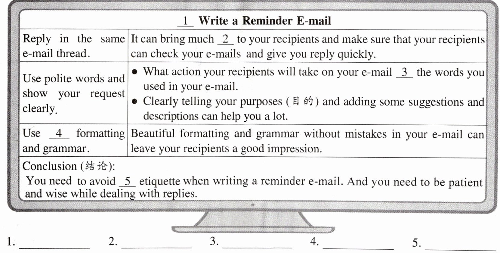 While you are sending a reminder e-mail to get a quick reply, you need to pay attention to the time a recipient (接受者) spends reading your e-mail. You have to follow some common e-mail etiquette (礼仪) that will help you write a perfect reminder e-mail. Here are some of them.