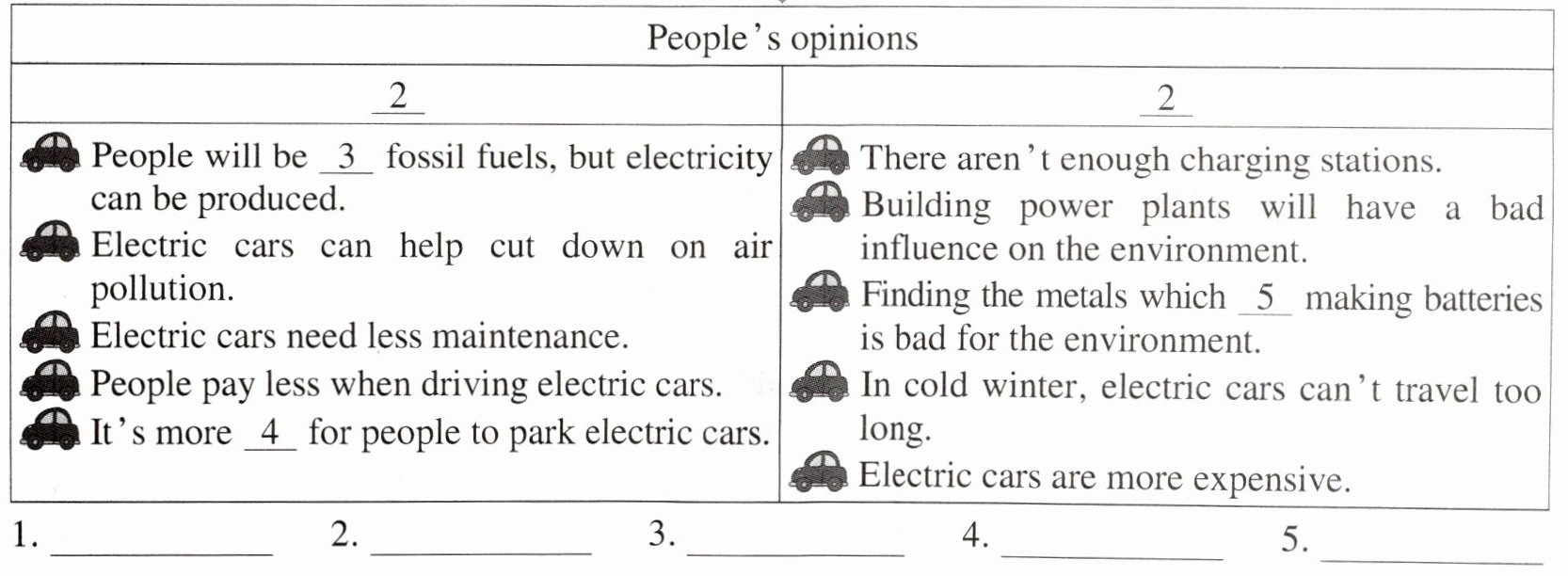 Other people hold the opposite opinion. Today, there are fewer charging (充电) stations than gas stations, which makes electric cars a lot less convenient for long trips. If we go all-electric, we would need to build more charging stations and power plants. Some power plants burn fossil fuels, which also pollutes the earth. In addition, the batteries (电池) of electric cars are made with rare metals (稀有金属). Finding these metals is bad for the environment. In cold weather, the chemical reactions in the batteries slow down. This shortens the distance (距离) an electric car can travel on one charge. Lastly, the price of a new electric car is about 11, 000 US dollars more than a new gas car.