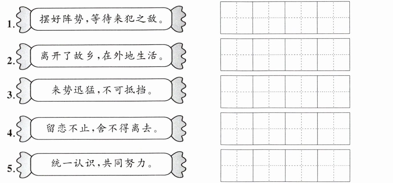 1. 严阵以待 2. 离乡背井 3. 势不可当 4. 流连忘返 5. 同心协力