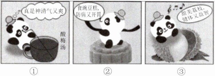 示例一:我选取第①张图片。可爱的大熊猫左臂轻放腹部悠然地躺着,边用吸管吮吸杯子里的酸梅汤,边美滋滋地想:真是神清气又爽。大熊猫化身节气文化宣传员,提醒人们夏至喝酸梅汤。图片反映了中国人根据节气合理饮食的生活智慧。 示例二:我选取第②张图片。图中憨态可掬的大熊猫头戴小帽,手挥彩带,站在豌豆糕上翩翩起舞,开心地说:“食豌豆糕,防病又开胃。”国宝大熊猫表明节气是中国特有的文化,豌豆糕清凉解暑,体现出顺时节而为的生活理念。 示例三:我选取第③张图片。头戴小帽的大熊猫满脸萌态,目光炯炯,双手扒着一颗果肉晶莹的荔枝,唱着“甜美荔枝,健体又益智”,告诉人们夏至要食荔枝。妙趣横生的图片表达了人们希望身体健康、头脑聪慧的美好愿望。