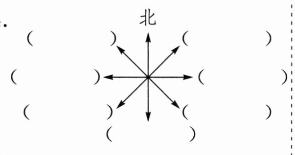 1. 根据一个确定的方向找其他三个方向的方法:面向南,背对(),左()右();面向北,背对(),左()右();面向东,背对(),左()右();面向西,背对(),左()右()。