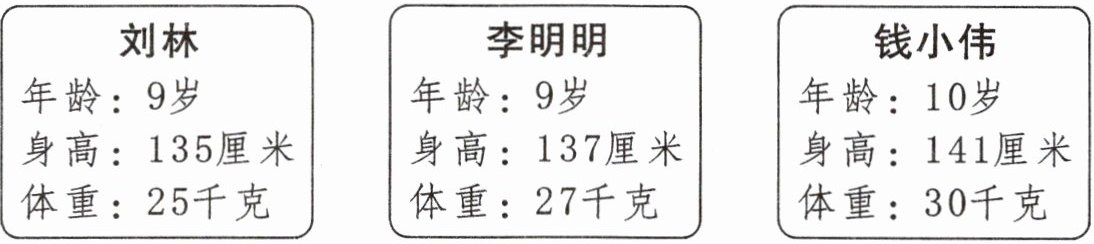 四、下面是三(1)班三名同学有关信息。你能在同一个表中把这些信息都表示出来吗?