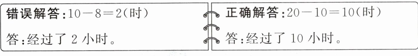 错因分析:用普通计时法计算经过的时间,应当先将其转化成24时计时法进行计算。上午10时,用24时计时法表示为10时;晚上8时,用24时计时法表示为20时。经过时间= 结束时刻-开始时刻。