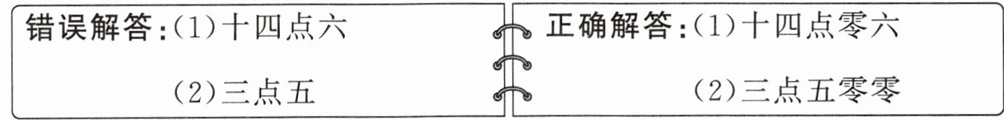 错因分析:错误解答错在没有掌握小数的正确读法。读数时,小数部分的“0”不要漏读,而应一一读出来。