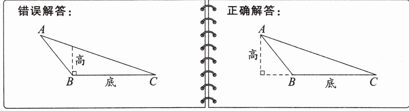 错因分析:画高时,一定要先找到底相对应的顶点,再从顶点到它的对边作一条垂线,顶点和垂足之间的线段叫作高。图中与指定底相对应的顶点是点 A,而不是点 B。