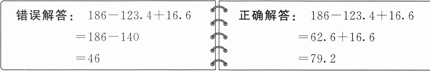 错因分析:小数加减混合运算中,交换数的位置时,要连同数前面的运算符号一同交换。给算式加括号时,也要注意数前面的运算符号的变化。