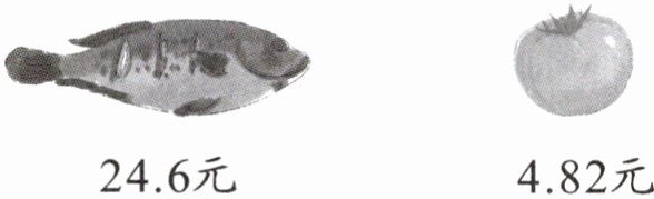 【解析】:根据题目所给信息,已知鱼的价格是$24.6$元,西红柿的价格是$4.82$元,妈妈给了售货员$100$元。方法一是先算买鱼后剩下的钱,再减去买西红柿的钱;方法二是先算买鱼和西红柿总共花的钱,再用$100$元减去总花费。两种方法都通过小数的加减法运算得出结果。