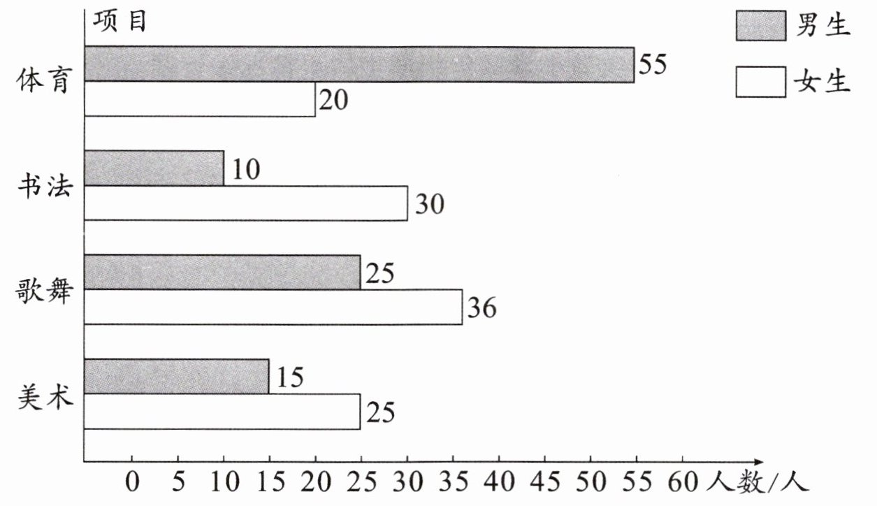 2. 女生参加( )小组的人数最多,参加( )小组的人数最少,相差( )人。