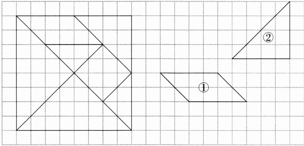 2. 对于图形①:先向左平移$7$格,再向上平移$2$格;对于图形②:先向左平移$12$格,再向下平移$4$格,然后绕直角顶点顺时针旋转$180^{\circ}$,就可以将这两个图形移入七巧板相应的位置。