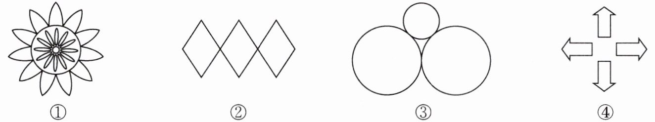 1. 下面各图中,可以由基本图形平移得到的图形是(),可以由基本图形旋转得到的图形是(),是轴对称图形的是()。