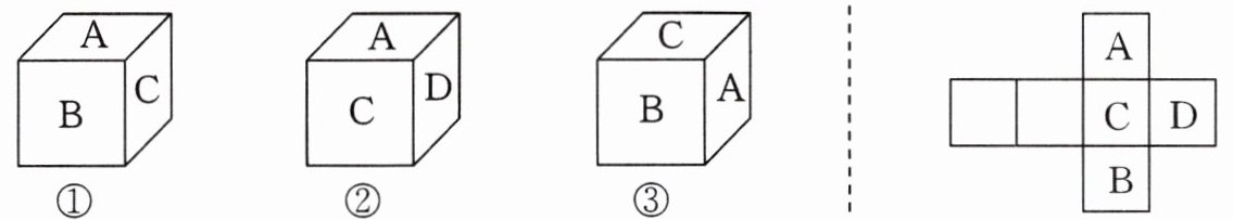 5. 下面三个正方体中,展开后能得到右图的是正方体()。
