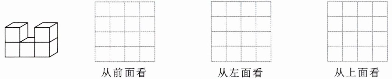 2. 观察几何体,在方格纸上画出从前面、左面和上面看到的图形。