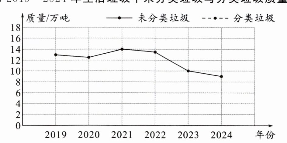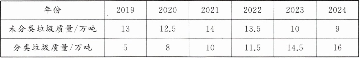 三、某市2019~2024年生活垃圾中未分类垃圾与分类垃圾质量统计如下。