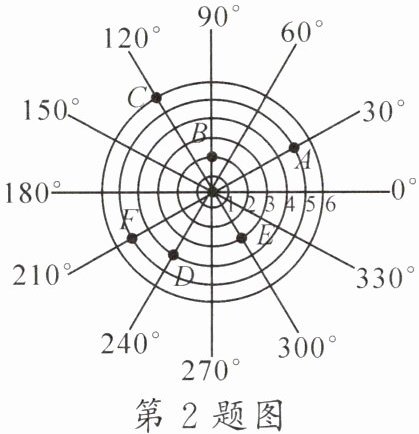 2.如图,雷达探测器测得六个目标A,B,C,D,E,F出现.按照规定的目标表示方法,目标C,F的位置表示为$C(6,120^{\circ }),F(5,210^{\circ })$.按照此方法在表示目标A,B,D,E的位置时,其中表示不正确的是 ()