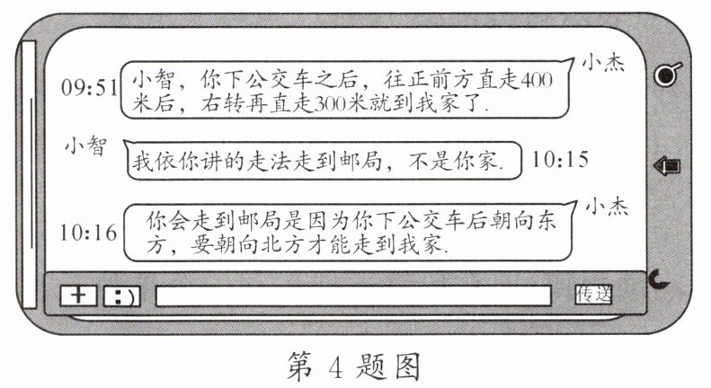 4.如图为小杰使用通讯软件跟小智对话的记录.根据图中两人的对话记录,若下列有一种走法能从邮局出发走到小杰家,则此走法为 ()