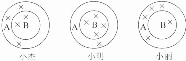 12. 课余活动中,小杰、小明和小丽一起玩飞镖游戏,飞镖盘上 A 区域所得分值和 B 区域所得分值不同,每人投 5 次飞镖,其落点如图所示,已知小杰和小明的 5 次飞镖总分分别为 39 分和 43 分,小丽的 5 次飞镖总分为____分.