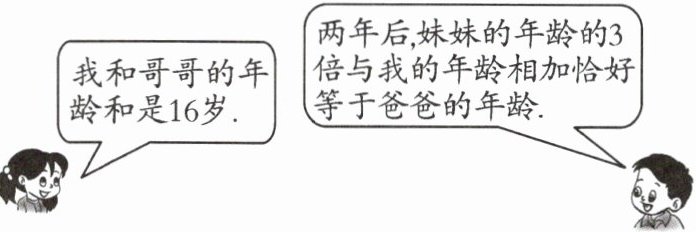 13.国际马拉松赛鸣枪开跑,一名34岁的男子带着他的两个孩子参加了比赛,下面是两个孩子与记者的对话.根据对话内容,请你用方程的知识帮记者求出哥哥和妹妹的年龄.