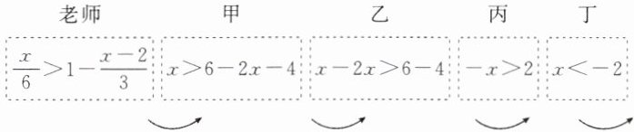 6. 老师设计了接力游戏,用合作的方式完成解一元一次不等式,规则是:每人只能看到前一人给的式子,并进行一步计算,再将结果传递给下一人,最后完成化简,过程如图所示:
