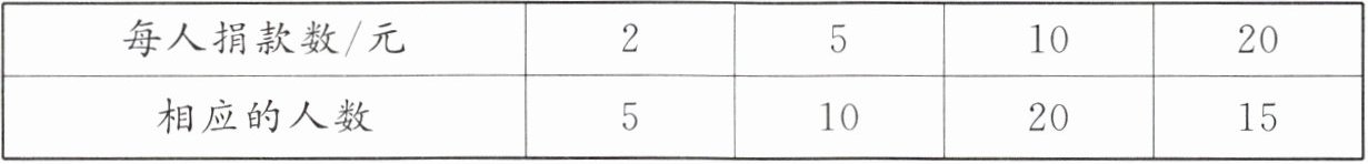 (2)$2×5+5×10+10×20+20×15=560$(元),答:该班共捐款 560 元.