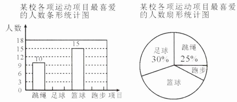 (1)观察条形统计图与扇形统计图知:喜欢跳绳的有 10 人,占 25%,故总人数有$10÷25\% =40$(人).