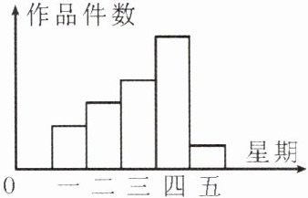 8. 为迎接学校艺术节,七年级某班进行班级歌词征集活动,作品上交时间为星期一至星期五.班委会把同学们上交作品的件数按每天一组分组统计,绘制了频数分布直方图如图.已知从左至右各长方形的高的比为 $2:3:4:6:1$,第二组的频数为 9,则全班上交的作品有______件.