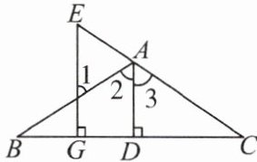 3.如图,$AD⊥BC$于点D,$EG⊥BC$于点G,$∠E= ∠1$,试问:AD是$∠BAC$的平分线吗?若是,请说明理由.