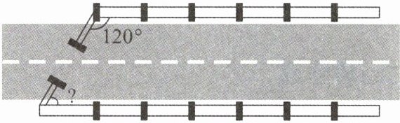 14. 如图,一条公路的两侧铺设了两条平行管道,如果公路一侧铺设的管道与纵向连通管道的角度为 $ 120^\circ $,那么,为了使管道对接,另一侧应以什么角度铺设纵向连通管道? 为什么?