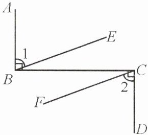 15. 如图,$ AB \perp BC $,$ BC \perp CD $ 且 $ \angle 1 = \angle 2 $.求证:$ BE // CF $.