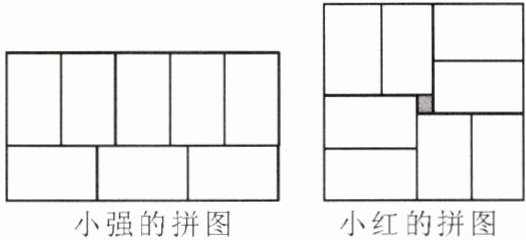 6.我校七年级(1)班小伟同学裁剪了16张一样大小的长方形硬纸片,小强用其中的8张恰好拼成一个大的长方形,小红用另外的8张拼成一个大的正方形,但中间留下一个边长为2cm的正方形(见图中间的阴影方格).请你算出小伟裁剪的长方形硬纸片长与宽分别是多少?