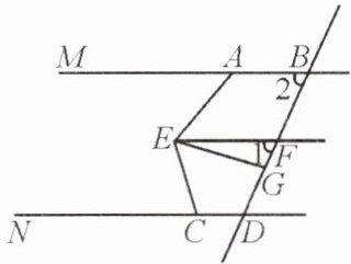 18. 如图,已知 $ \angle 1 = 60^\circ $,$ \angle 2 = 60^\circ $,$ \angle MAE = 45^\circ $,$ \angle FEG = 15^\circ $,$ EG $ 平分 $ \angle AEC $,$ \angle NCE = 75^\circ $.