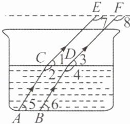 17. 光线在不同的介质中传播的速度是不同的,因此当光线从水中射向空气时,要发生折射,由于折射率相同,所以在水中平行的光线,在空气中也是平行的.如图所示,$ \angle 1 = 45^\circ $,$ \angle 2 = 122^\circ $.求图中其他角的度数.