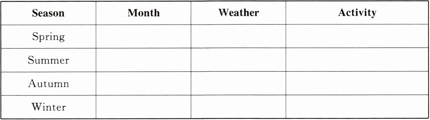 任务二:通过阅读上面的短文,我们了解了悉尼的四季。请结合表格提示介绍你所在城市的四季以及人们在不同季节进行的活动吧。