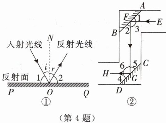 4. 【阅读材料】如图①,在光的反射现象中,把经过入射点 O 并垂直于反射面的直线 ON 叫作法线,入射光线与法线的夹角 i 叫作入射角,反射光线与法线的夹角 r 叫作反射角,且$i= r$,这就是光的反射定律。
