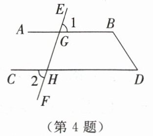 4. 如图,已知直线$EF与AB$,$CD分别相交于点G$,$H$,且$∠1= ∠2$。若$∠D= 60^{\circ }$,则$∠B= $______$^{\circ }$。