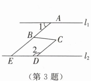 3. 如图,直线$l_{1}// l_{2},∠ABC= ∠C$。若$∠1= 40^{\circ }$,则$∠2= $______°。