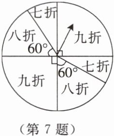 7. 某商场为了吸引顾客,设立了一个可以自由转动的转盘,如图所示,并规定:顾客一次性消费300元及以上,就能获得一次转动转盘的机会,如果转盘停止后,指针正好对准九折、八折、七折区域,那么顾客就可以获得对应的优惠;如果指针恰好停在分割线上,那么需重新转动转盘。
