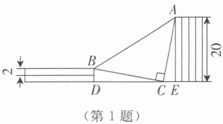 1. 如图,书架两侧摆放了若干本相同的书籍,左右两摞书中竖直放入一个等腰直角三角尺,其直角顶点C在书架底部DE上。当顶点A落在右侧书籍的上方边沿时,顶点B恰好落在左侧书籍的上方边沿。若每本书长20cm,厚度为2cm,则两摞书之间的距离DE为()
