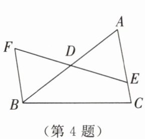 4. 如图,$D是AB$的中点,要使$△BDF\cong △ADE$,应添加的条件是(只需填写一种情况)。