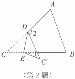 2. 如图,在三角形纸片ABC中,$\angle A= 65^{\circ}$,$\angle B= 70^{\circ}$。将$\angle C$沿DE对折,使点C落在$\triangle ABC外的点C'$处。若$\angle 1= 20^{\circ}$,则$\angle 2= $()